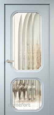 Коллекция межкомнатных дверей с широкой фигурной фрезеровкой и рифлёным стеклом.