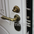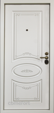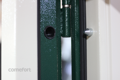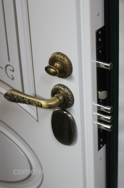 Защитные свойства данной модели придает замок Гардиан 30.11 - 3 класса защиты, сувальдный с защелкой, производство - Россия. Хромированные противосъемные штыри служат дополнительной защитой двери от выпиливания. Ночная задвижка позволяет фиксировать положение входной двери в закрытом состоянии изнутри.